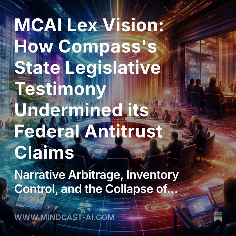 MindCast AI’s prior analysis of Compass’s narrative pre‑installation strategy identified, in advance of the hearings, how Compass seeded antitrust language (”consumer choice,” “innovation,” “incumbent protection”) into non‑judicial forums. Legislative testimony tested that pre‑installed narrative under neutral questioning—and the narrative failed.