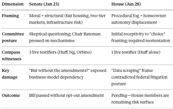 Orbino never spoke. The transcript shows the Chair moved immediately to other testifiers. His disappearance suggests tactical retreat. His Senate testimony had provided the “Baptist” moral cover (protecting the vulnerable) for Compass’s “Bootlegger” commercial interest (preserving double-end capture). Once the “privacy” narrative began collapsing under questioning in the Senate—with Chair Bateman’s “But without the amendments?” exposing the business-model dependency—Compass withdrew its storytellers rather than exposing them to a House committee that had already signaled hostility to the framing.