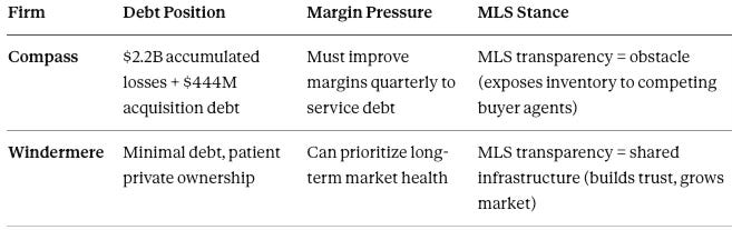 A firm without debt pressure can prioritize long-term market health over short-term margin capture. Compass cannot. If transparency rules entrenched incumbents—as Compass argues in federal court—the dominant incumbent would oppose them. Windermere’s support for transparency falsifies Compass’s “incumbent protection” theory.