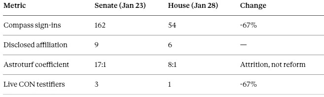 The House hearing revealed that Compass’s coordinated opposition could not sustain itself under continued scrutiny. Participation dropped 67% between chambers—from 162 sign-ins at the Senate to 54 at the House—while concealment rates remained constant.