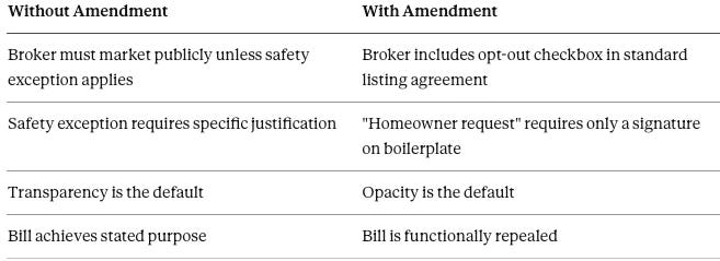 Standard listing agreements are form contracts. If the amendment passes, brokerages would simply add a pre-checked “opt-out” clause to their standard forms. Sellers signing listing agreements—already dozens of pages of boilerplate—would “request otherwise in writing” without meaningful deliberation. The opt-out would become the default, not the exception.