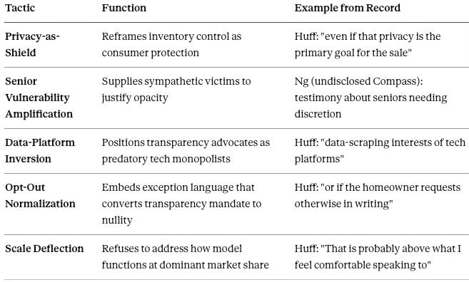 When Compass executives testified before the Washington State Legislature in January 2026, opposing proposed transparency legislation, the testimony did not merely create political controversy; it stress-tested the company’s narrative architecture—and the architecture collapsed. Witnesses could not explain how the business model functions without opt-outs, could not articulate buyer-side effects, could not cite the statutes they claimed already address fair housing concerns, and reduced compliance to “education” rather than enforceable mechanisms.