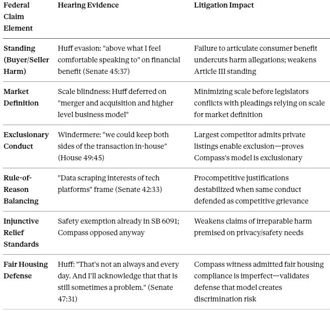 Defense counsel in both federal cases can cite Windermere’s testimony as market-participant confirmation that private exclusives are inherently exclusionary. The argument: Compass’s own business model—defended before the legislature—is the same model that the dominant incumbent describes as a monopolization tool. Compass cannot claim its conduct is procompetitive when the market leader explains precisely how the same conduct would destroy competition if deployed at scale.