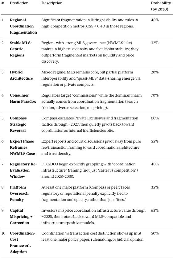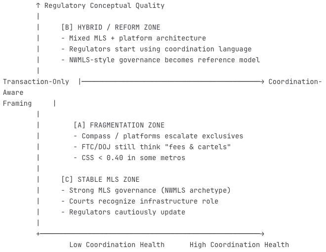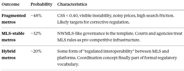 Scenario B: MLS Stability (32% probability) Regions with strong MLS governance—NWMLS being the archetype—maintain coordination architecture. Courts and regulators recognize MLS rules as pro-competitive infrastructure rather than cartel restraints. These regions outperform fragmented markets on liquidity, price discovery, and consumer welfare.