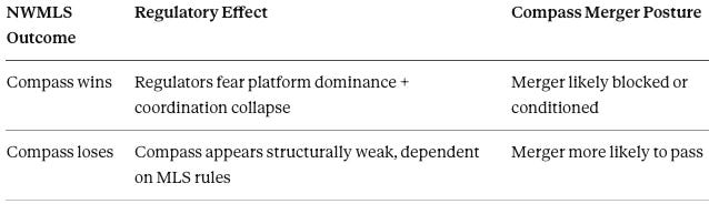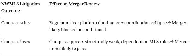 Merger review presents a direct application of coordination cost analysis to regulatory decision-making. The pending Compass-Anywhere transaction illustrates how conventional concentration metrics can miss systemic risks that the coordination cost framework reveals. This section demonstrates what merger review looks like when coordination architecture is treated as a variable.