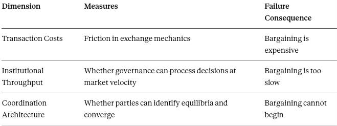 The critical insight: Transaction costs measure friction within the bargaining mechanism. Coordination costs measure whether the mechanism can engage at all. The categories are analytically independent: a system can have zero transaction costs and catastrophic coordination costs.