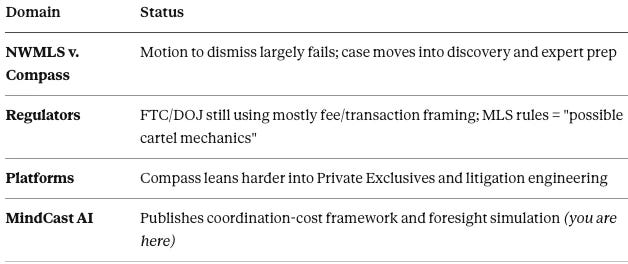Expert Phase Reframes NWMLS Case (55%): Litigation shifts toward coordination architecture framing