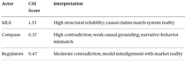 Section VI presents the CDT metrics underlying the simulation: causal signal integrity, institutional responsiveness, behavioral drift, credibility tension, and adaptability scores for MLS, Compass, and regulators.