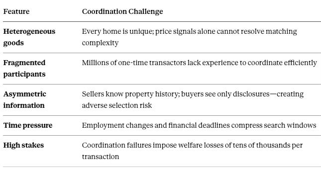 Five structural features make residential real estate uniquely dependent on coordination architecture: