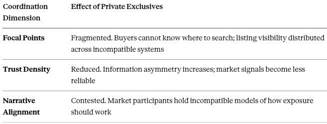 Without this focal point, the market fragments. Buyers search across platforms with no guarantee of completeness. Sellers cannot assess exposure. The coordination mechanism fails even though no transaction cost barrier exists.