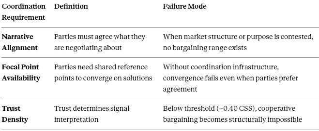 When narrative alignment fails—when participants hold competing definitions of market structure—no bargaining range exists. This is precisely what occurs when “private exclusive” models fragment the market into incompatible coordination systems.