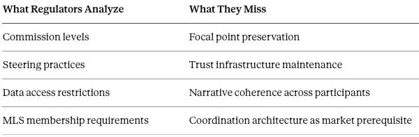 MLS cooperation solves a coordination problem that transaction cost analysis cannot see. When regulators dismantle coordination architecture believing they are removing competitive barriers, they risk fragmenting America’s largest asset market into incompatible systems where matching becomes structurally impossible.