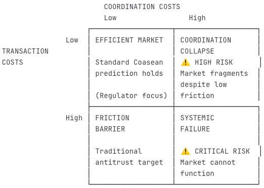 Where regulators focus: Lower-left quadrant (high transaction costs, low coordination costs). Traditional antitrust targets friction barriers that prevent otherwise-capable parties from bargaining.