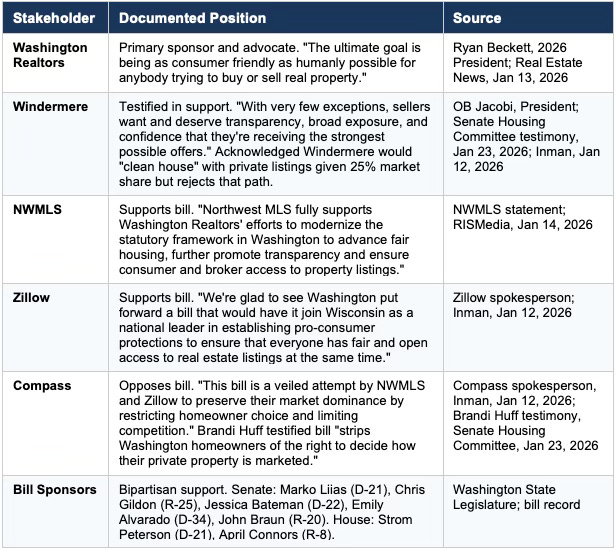 The January 23, 2026 Washington State Senate Housing Committee hearing on SB 6091 serves as the linchpin for this analysis. The hearing produced direct testimony from both Compass and Windermere leadership, revealing the divergent equilibrium strategies in real time. Compass’s advocacy for broad “seller request” exceptions—documented in The Compass Astroturf Coefficient at the Washington State Senate (January 2026)—provides the primary source material for modeling how platform actors operationalize exception capture.