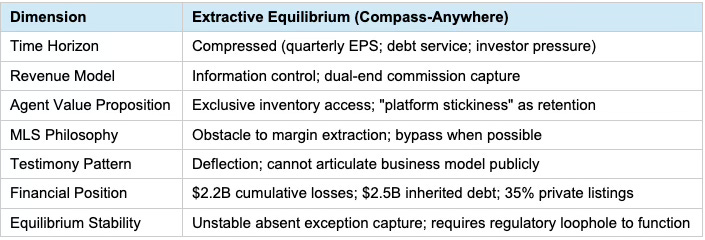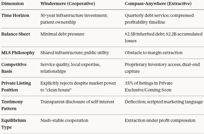 Compass’s pursuit of private listings is the rational response to profit timeframe compression, just as Windermere’s rejection of the same path is the rational response to different incentive geometry. Policy must address the structural conditions that produce extraction rather than assuming that market participants will choose cooperation absent the constraints that make cooperation rational.
