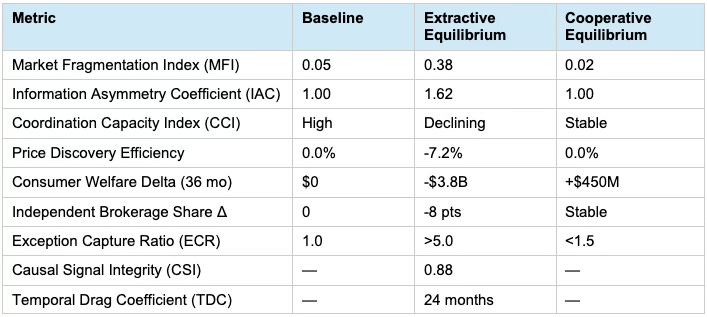 Price discovery remains robust because sellers receive exposure to the full buyer pool rather than a platform-curated subset. Bidding competition reflects market depth; sellers maximize equity through broad exposure rather than accepting the first internal offer. The Price Discovery Efficiency metric shows no deviation from the theoretically efficient price (0.0%), compared to the -7.2% deviation projected under the extractive equilibrium. The 7.2% differential represents the “search tax” that buyers pay and the bidding-war premium that sellers forfeit when inventory is sequestered.