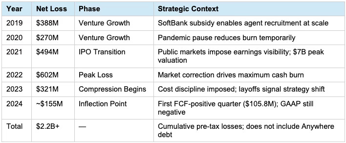 Compass’s financial trajectory illustrates this compression with unusual clarity. The company accumulated $2.2 billion in losses between 2019 and 2024, funded first by SoftBank’s venture capital and then by public markets following its 2021 IPO. The 2024 transition to positive free cash flow—highlighted in management’s Q4 2025 earnings call—marked the inflection point where the growth-phase tolerance for losses ended and the profitability-phase demand for margin capture began. The January 2026 merger with Anywhere Real Estate accelerated this compression by adding $2.5 billion in inherited corporate debt to Compass’s balance sheet.