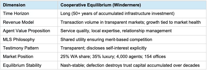 By contrast, Windermere Real Estate exhibits a cooperative equilibrium. Its testimony before the Washington Senate Housing Committee concedes that private listings would be profitable in the short term—Windermere would “clean house” given its 25% statewide market share and 35% dominance in the luxury segment. Yet the firm explicitly rejects that path to preserve the coordination infrastructure that sustains long-run transaction volume and trust.