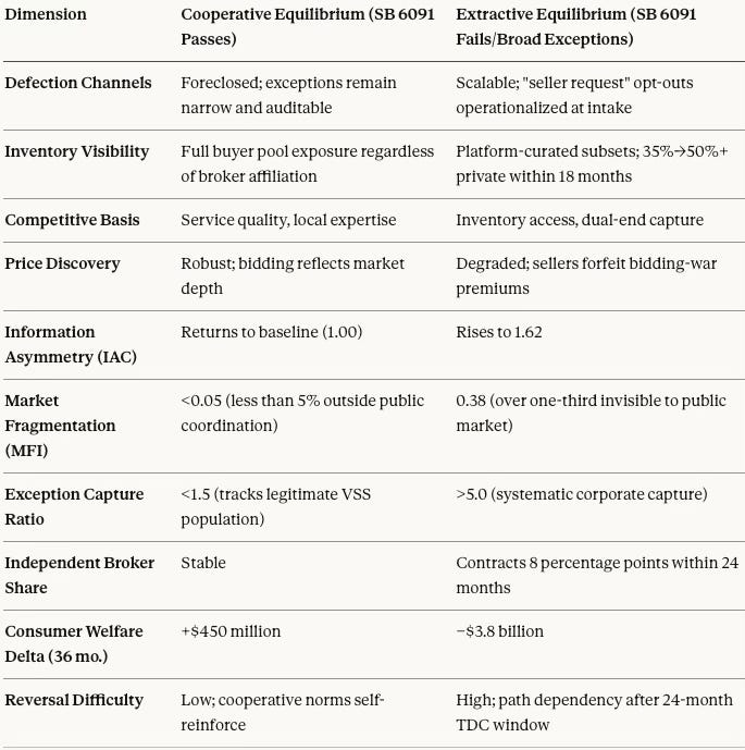 Compass model: In the extractive equilibrium (SB 6091 fails or includes broad exceptions), the MFI rises to 0.38, meaning over a third of inventory becomes invisible to the public market; sellers lose bidding-war premiums; buyers pay “search taxes” to access sequestered inventory; and the Consumer Welfare Delta reaches negative $3.8 billion over 36 months.