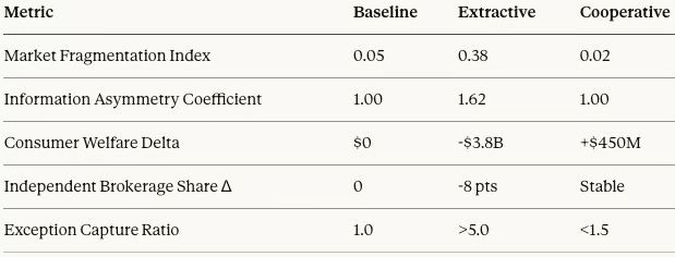 Consumer Welfare Delta under this scenario reaches -$3.8 billion over 36 months, reflecting lost bidding premiums, increased search costs, and degraded trust infrastructure. Independent brokerage market share contracts by 8 percentage points within 24 months as service quality ceases to be the primary competitive dimension. The concentration of inventory within walled gardens eventually necessitates federal antitrust intervention as the welfare costs become undeniable.