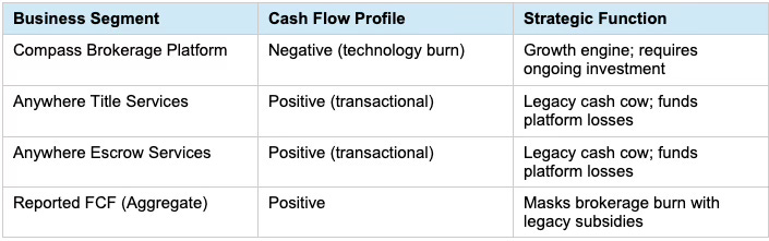 Following the Anywhere merger, management narrative shifted heavily toward “Positive Free Cash Flow” as the lead metric. The arbitrage operates by aggregating high-margin legacy assets with loss-leading technology divisions, creating the appearance that the brokerage platform is self-sustaining when it is actually subsidized by Anywhere’s Title and Escrow businesses: