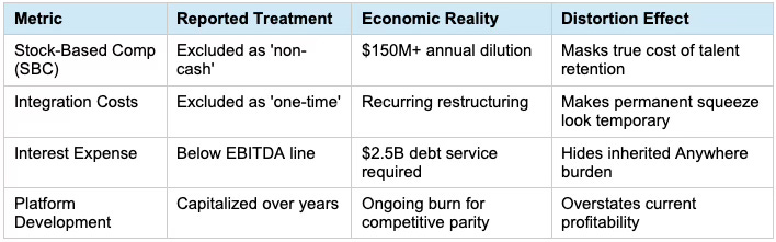 Stock-Based Compensation exclusion is particularly significant because SBC has historically exceeded $150 million annually. By treating the cost of talent—the firm’s primary asset in a brokerage model—as a “non-cash expense,” management projects profitability that ignores massive shareholder dilution. In the context of the Anywhere merger, this treatment masks the actual cost of servicing inherited debt because interest payments are real cash outflows that EBITDA ignores by definition.