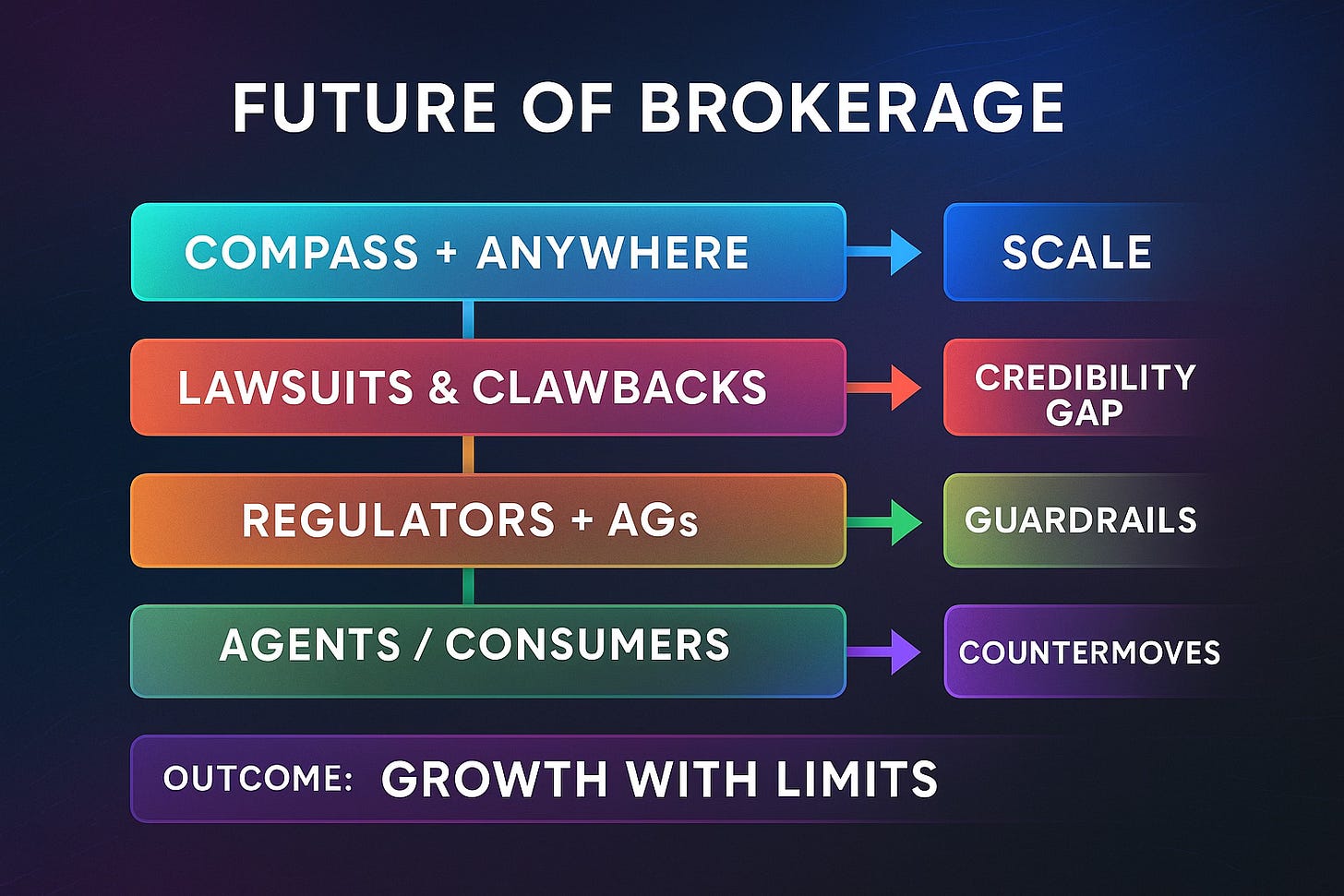 Compass adds complexity by suing the Northwest MLS and Zillow for anti-competitive practices. While it frames itself as a cartel challenger, it simultaneously consolidates into the largest brokerage in history. Regulators will ask directly whether Compass is breaking monopolies or building one.