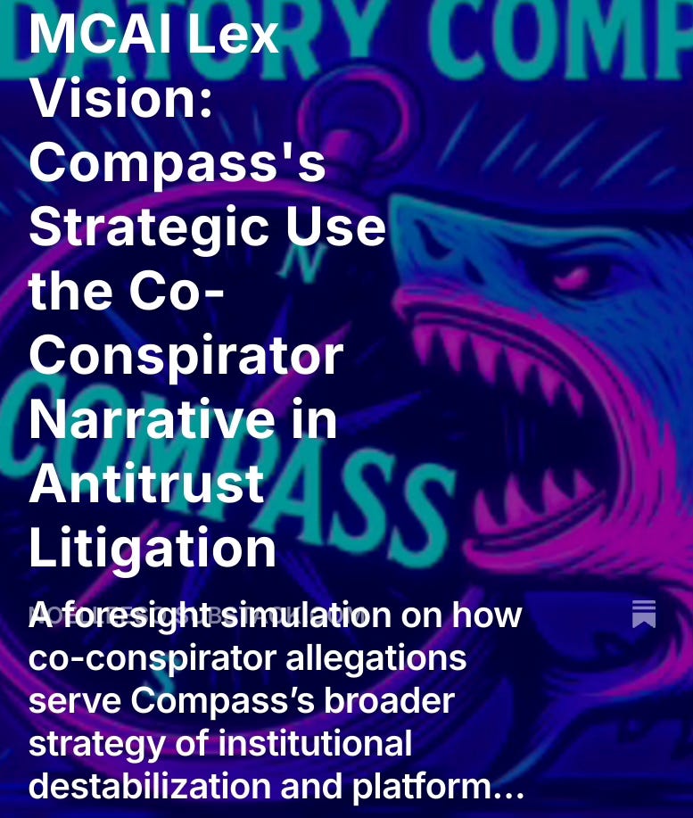 This legal framing draws from prior analysis in MCAI Lex: Chutzpah: Weaponizing Antitrust. Compass accuses others of enforcing exclusion while it defends its own private firewall. That contradiction is not incidental. It is the strategy.