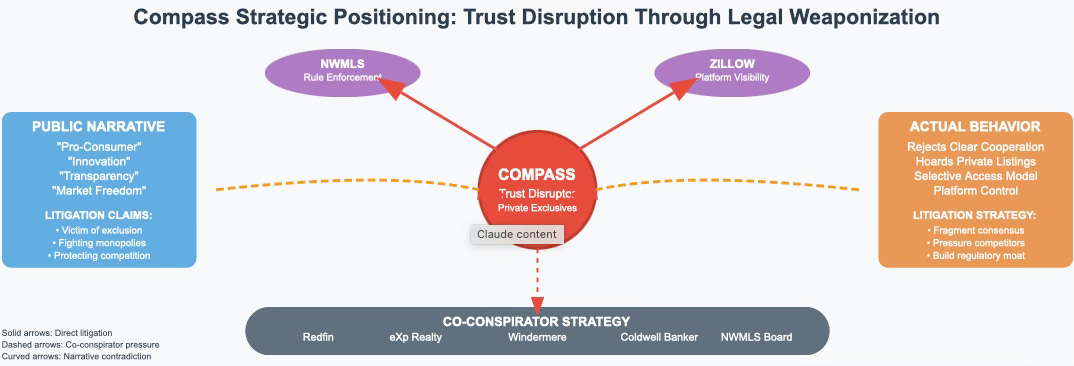 Compass’s litigation is not reactive. It is premeditated policy destabilization dressed in legal grievance. By naming “co-conspirators,” Compass disrupts alignment across MLSs and platforms. It isolates enforcers and polarizes the field.
