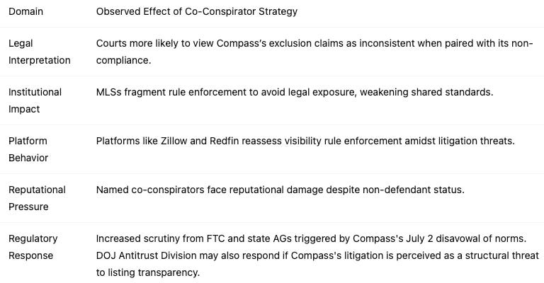 Named co-conspirators became reputational targets despite adhering to open-market policies. MLSs reconsidered enforcement alignment. Platforms delayed rule enforcement to avoid being caught in Compass’s narrative dragnet.