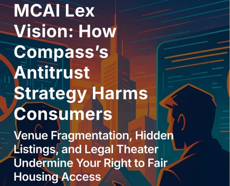 This legal brief provided quantified evidence of consumer harm created by Compass's Private Exclusive strategy, documenting 18-22% inventory reduction in major urban markets and 15% reduction in consumer choice where Compass concentrates its exclusive practices. MCAI identified specific vulnerable populations systematically excluded from Compass's private networks: first-time homebuyers, minority and immigrant buyers, and clients of independent brokerages. The analysis revealed Compass's legal contradiction—demanding access to Zillow's platform while restricting access to its own listings—as evidence of strategic gatekeeping. The work established that Compass's lawsuit against Zillow represents antitrust theater: using federal courts to dismantle consumer protection mechanisms while claiming to champion market freedom.