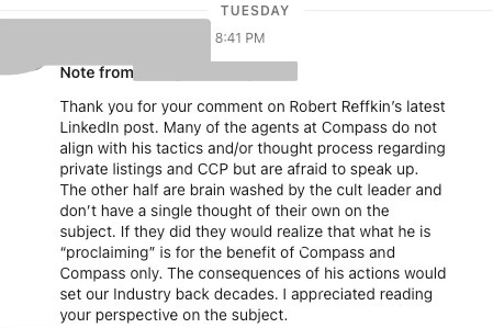This message was sent to me privately after I commented on Robert Reffkin’s LinkedIn post. It reflects a pattern I’ve seen repeatedly: silent dissent, reputational fear, and disillusionment inside Compass. For their protection, I’ve redacted the sender’s identity — but their words speak volumes.