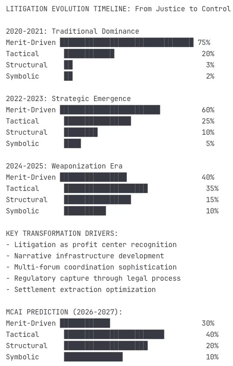 The fundamental transformation of litigation from dispute resolution to institutional warfare creates unprecedented challenges that traditional legal analysis cannot address. This shift manifests through specific patterns that MCAI's predictive cognitive AI has documented across multiple jurisdictions and case types.