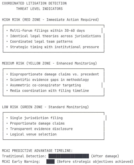 Early Warning System Integration: MCAI's systematic detection capabilities provide institutional foresight - enabling proactive defense against sophisticated legal warfare tactics before they achieve manipulation objectives.