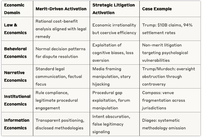 MCAI's behavioral economics framework analyzes litigation through five distinct economic lenses that reveal strategic versus legitimate legal behavior, providing clear behavioral signatures that distinguish justice from leverage. This multi-domain analysis connects directly to the profit center transformation of litigation, showing how sophisticated actors exploit economic incentives to achieve non-legal objectives. Merit-driven cases typically activate one or two domains with rational patterns, while strategic litigation simultaneously exploits multiple domains to create coercive effects.