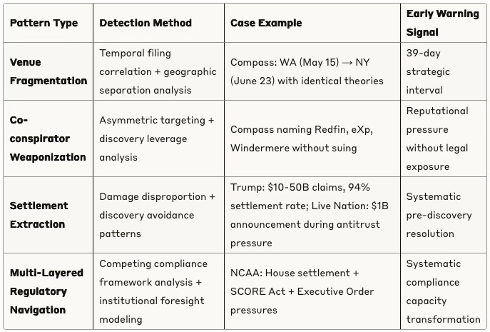Multi-Forum Procedural Warfare demonstrates how sophisticated actors fragment oversight through coordinated venue selection. MCAI's cross-jurisdictional analysis of Compass's litigation campaign reveals deliberate geographic separation (Washington + New York) designed to prevent pattern recognition while maximizing institutional pressure. The 39-day filing interval between NWMLS and Zillow cases, combined with identical legal theories across distant jurisdictions, indicates systematic strategic planning rather than organic dispute development.