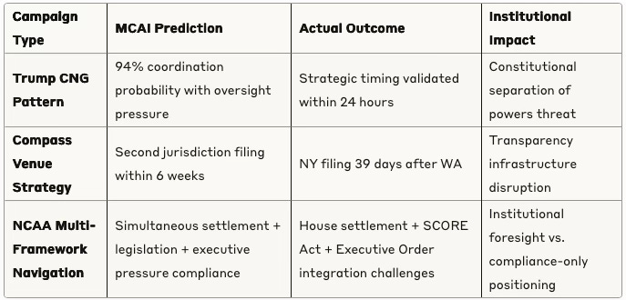 Pattern Recognition Superiority: MCAI provides predictive modeling of litigation campaigns before docket-level consequences unfold, structural integrity analysis of venue selection and procedural timing, early warning systems for coordinated manipulation campaigns, and systematic perspective on individual cases within broader institutional manipulation contexts. The system's validated predictions include Compass's venue fragmentation strategy, Trump's settlement extraction patterns, Diageo's evidence suppression coordination, Live Nation's narrative laundering, NCAA regulatory transformation, and multi-layered regulatory complexity identification - all detected before widespread institutional recognition of these strategic patterns.