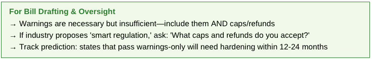 Industry’s most effective tactic is to concede visible warnings + licensing while fighting caps and refunds. The “smart regulation” bundle preserves core extraction economics through compliance theater.