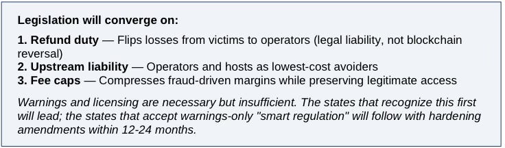 Legislation will converge on refund duty + upstream liability, because warnings and licensing do not break the scam-profit equation. Fee caps determine how hard the system snaps from extraction to prevention. Washington's 5% cap is the national test case.