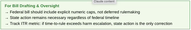 5. Binding timelines — If rulemaking is required, impose 12-month deadlines with automatic fallback provisions if agencies miss them.