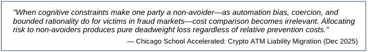 Establishes the analytical framework for liability allocation in crypto-ATM fraud. Classical Posner asks “who can prevent harm most cheaply?” The behavioral extension asks “who can prevent harm at all?” Demonstrates that victims under coercion are non-avoiders by behavioral incapacity, making operators the necessary liability bearers.