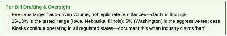 2. Explicit fee caps — Statutory 15-18% ceiling. Fee caps align crypto-ATM fees with traditional remittance services, not restrict markets.
