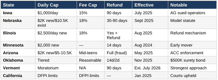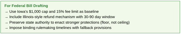Practical ask: If your state is not in this table, you are behind the national consensus. Use Iowa ($1,000 cap, 15% fee, 90-day refund) as your drafting template.