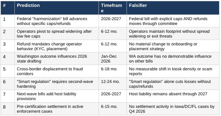 Prediction: At least 6–10 additional states will enact hard crypto-ATM protections in 2026–2027 before federal rulemaking produces binding safeguards.