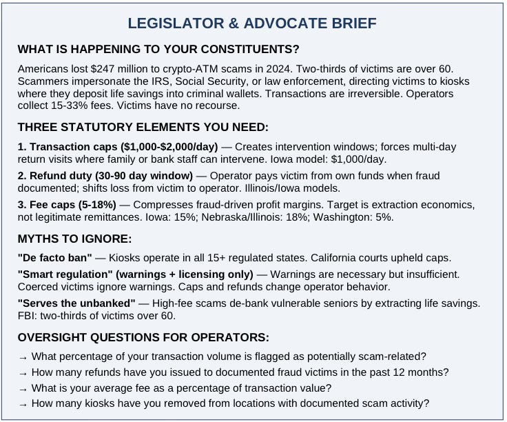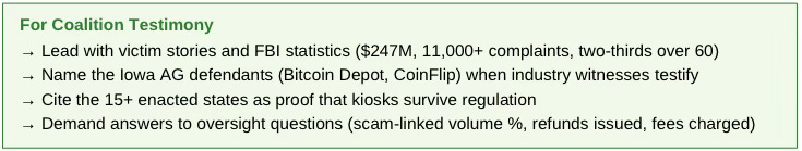 5. Counter the “financial inclusion” narrative directly. Industry claims kiosks serve the “unbanked.” The data shows the opposite: high-fee scams de-bank vulnerable seniors by extracting life savings. FBI data confirms two-thirds of victims are over 60. Frame your advocacy as protecting financial inclusion for seniors, not restricting it.