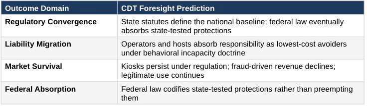 Using multiple CDT foresight simulations grounded in law-and-economics, behavioral science, and institutional analysis, MindCast AI evaluates how liability migrates upstream from victims to operators, how incentives reshape fraud economics, and how legislative systems adapt under pressure. The findings predict continued state-led convergence around hard statutory protections, accelerated settlement dynamics for operators, and eventual federal absorption of state baselines rather than federal preemption.