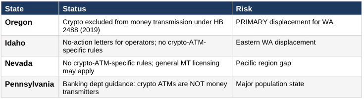 Practical ask: If your state looks like Oregon, Idaho, Nevada, or Pennsylvania in this table, you are the next fraud corridor unless you legislate. Scammers will direct victims to your kiosks once neighboring states regulate.