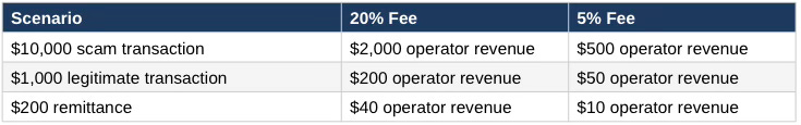 The insight: High fees make fraud-driven transactions disproportionately profitable. Fee caps compress margins on alltransactions, but the largest impact falls on high-dollar fraud. Legitimate small remittances ($50-200) remain viable at lower fee percentages—they are not the target.