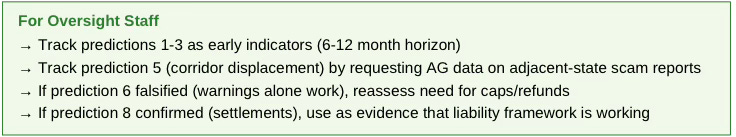 Prediction: In close votes, lawmakers pass “smart regulation” versions first. Then: AG enforcement actions reveal continued harm, media investigations document operator knowledge, victim stories accumulate, and the second wave adds caps/refunds. Timeline: 12-24 months from “smart regulation” to hardening amendments.