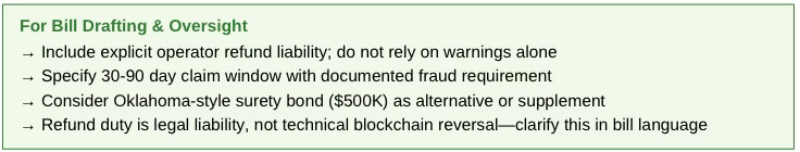 The mechanism functions like a consumer guarantee or surety bond requirement. Oklahoma’s $500,000 surety bond is a related model: operators post capital that can be accessed for victim compensation. The Iowa and Illinois refund windows create direct operator liability without requiring bond posting.